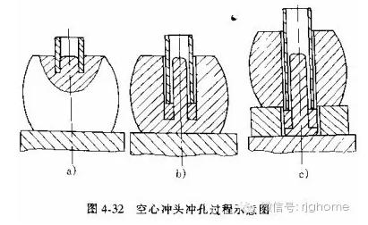 大型鍛件在水壓機(jī)上沖孔時(shí),當(dāng)孔徑大于φ450mm時(shí),一般采用空心沖頭沖孔,這樣可以減小B區(qū)外層金屬的切向拉應(yīng)力,避免產(chǎn)生側(cè)表面裂紋,并能除掉錠料中心部分質(zhì)量不好的金屬。