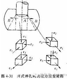 沖孔時(shí)沖頭下部的A區(qū)金屬是直接受力區(qū),其周圍的B區(qū)金屬是間接受力區(qū)A區(qū)金屬的的變形可看做是環(huán)形金屬包圍下的鐓粗,A區(qū)金屬被壓縮后高度減小,橫截面積增大,向四周徑向外流,但受到環(huán)壁的限制,故處于三向受壓的應(yīng)力狀態(tài),其應(yīng)力應(yīng)變簡圖如圖4-31所示。B區(qū)之受力和變形主要是由于A區(qū)的變形引起的。A區(qū)金屬徑向外流時(shí),使B區(qū)金屬徑向受壓,切向受拉,在高度方向,A區(qū)金屬向下流動時(shí),借助剪切應(yīng)力對B區(qū)金屬有一個(gè)拉縮作用。愈靠近內(nèi)側(cè)受拉縮愈嚴(yán)重。沖孔時(shí)D/d愈小,即B區(qū)愈薄時(shí),拉縮和走樣愈顯著。但是,如果B區(qū)很厚,即D/d很大時(shí),B區(qū)外側(cè)的σ1、σ2、σ3均很小,可能處于彈性狀態(tài),僅內(nèi)側(cè)發(fā)生塑性變形,這時(shí)B區(qū)的內(nèi)側(cè)金屬徑向被壓縮,高度可能增大,猶如打硬度一樣,“走樣”很小。